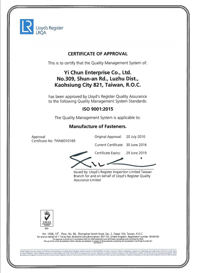 ISO 9001: 2008 issued by Lloyd's Register Inspection Limited on Jul.20 2010 and